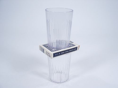 Two glasses are shown and four half dollar size coins are dropped into one and covered with a handkerchief. A deck of cards as a barrier is placed on one mouth up glass and the covered glass with coins is placed on top of the deck of cards. The magician moves away and a coin is seen and heard to fall in the lower glass! Within a few seconds another falls followed by the third and fourth coins! This is a very magical effect and one accomplished by a special well made mechanism. Includes glasses and special deck along with a coin stand as well. Handkerchief and coins not supplied. Includes instructions. Condition very fine.