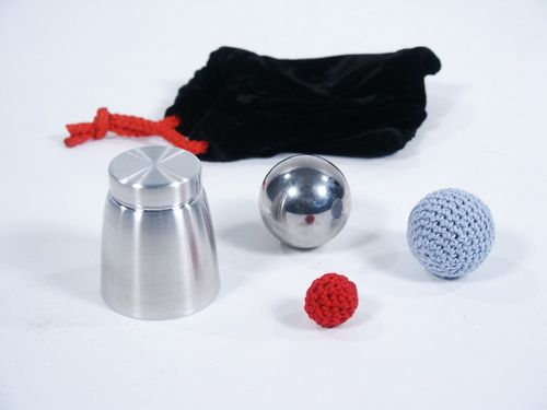 Called Petite as the cup measures 1 3/4” high with a mouth diameter of 1 7/16”. The routine begins by a small ball taken from the cup and placed in the hand and reappearing underneath the cup. It is taken and placed in the pocket and spectator is asked if they saw the small ball return under the cup. The cup is lifted and now a larger ball has made its appearance! This larger ball is placed in the pocket and again spectator asked if they saw it go back. Whatever the answer the cup is lifted and a large steel ball bearing is underneath and it is picked up and dropped in their hand with the magician stating “This is a heavy trick”. Includes instructions and from 1986. Includes all balls and velvet drawstring bag. Condition like new, never used.