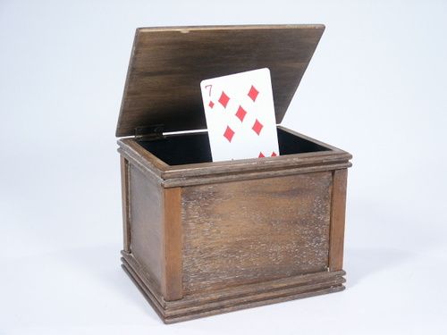 This mechanical chest made of wood measures 6 1/2” wide x 5 1/4” high x 5” deep. Three different cards are selected from a deck and then returned and shuffled. The chest is shown empty and the cards are tossed in after which the selected cards rise one after another. Includes deck and instructions. Condition very good.