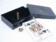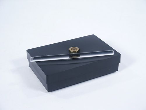 Magician shows a box with a brass bolt fastened with a brass nut through the dead center holding it all together. Removing the nut from the bolt and then removing the bolt from the box the magician can then take a pencil or wand and push it through and spin the box on it. Once this is done the pencil or wand is removed and the box is opened and the spectators see within the box a full deck of cards which are removed and spread showing no hole whatsoever! Includes instructions and includes small clear magic wand. You won't believe the deck of cards that comes with this. Condition very fine.