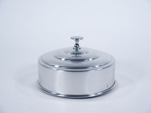 One of the more attractive style pans made having a diameter of 6 3/8” and a top tier design that adds deception to the size of load contained within. Light scuff marks to finish otherwise very fine.