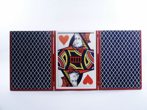 The cards each measure 10 1/2" wide x 15 1/4" high made with wood frames and bright colors to be seen at a great distance. The case which the cards are contained within opens and makes into a three partition easel for this classic effect of Find The Lady. The easel is made of lacquered wood and the entire outfit is one to be proud of. Includes instructions. Condition very fine. | |