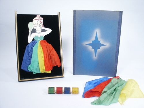 From Great Britain. A large blank frame is shown and screen placed around it. Color spools of thread are picked up one at a time and squeezed in the hands and they change into beautiful silks. The silks that have been magically produced are dropped over the top of the screen after which it is removed and a picture of a beautiful woman wearing a colorful gown made from the silks is now seen!