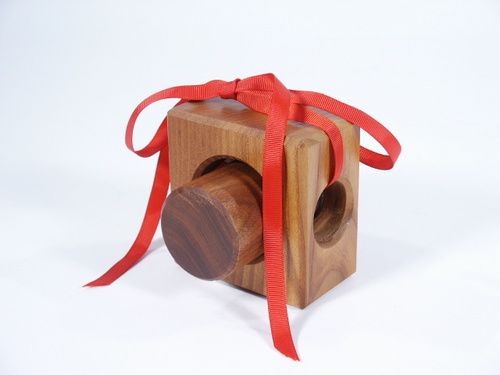 Made by Mel Babcock in solid woods. A cylindrical block is fit into a thick wood frame and ribbon threaded through both. While one or two people hold the ribbon the magician removes the block!
