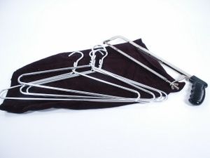 Book is Mike Caveney's Linking Coathangers, soft bound, 32 pages with illustrations. Set of 4 Coathangers along with hack saw all in a cloth carry bag. Not only will you mystify but you will have lots of opportunity for funny lines of patter. Hack saw blade has a few spots on underside of blade, hangers in very fine condition. | |