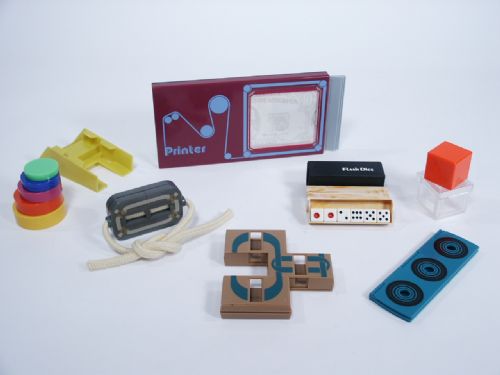 7 Tenyo Magic Items Grouping. Items includes: *1981 T-109 The Midas Machine, *T-72 Flash Dice, *T-73 Super Coin In Nest, *2001 T-200 Undercover Cube, *1981 T-108 Soft Coins, *1981 T-110 Zig Zag Cig, *Tenyo Zig Zag Rope. All have instructions with exception of Zig Zag Rope and all in fine condition.