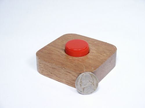 A nickel is shown and dropped in a recess in a wood block and a red plug is used to cover the coin. The block is picked up and turned over showing the nickel in a smaller opening in the underside and it is replaced upon the table with the request that a spectator simply remove the red plug and they may keep the nickel. Try as they may they fail yet the magician is able to remove the red plug and keep the nickel. Includes the original 1940's nickel this was found with. Condition very fine.