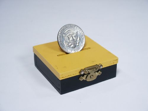 A wooden chest measuring 2 1/2” x 2 1/2” x 7/8” thick is shown to have a square of glass within which of course obstructs any passage of a coin through a slot in the center top and bottom. No worry to the magician as a half dollar size coin (not supplied) passes through without harm to the glass! If you don't use the glass you could use a silver dollar size coin or other instead. Includes instructions. Condition very fine.