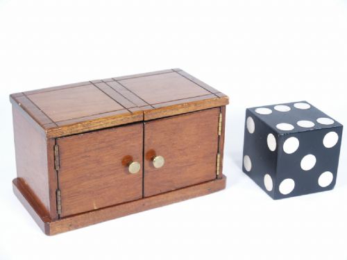 A nicely made box with die in 3 1/4” size with features of double door and nice sounding mechanism. The wood is solid without veneers and hinges are inset and of brass. Condition is good used with edge wear and this one built to last and will hold up to many performances.