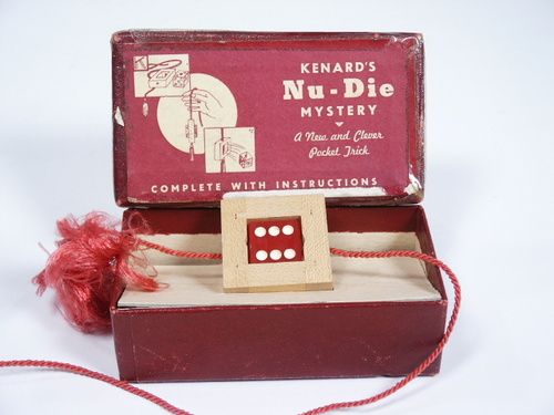 This is one of the early versions with a wood frame. Die threaded upon cord within frame makes its escape. Includes extra something not seen in photo. Box is tape reinforced. Includes instructions. Condition fine.