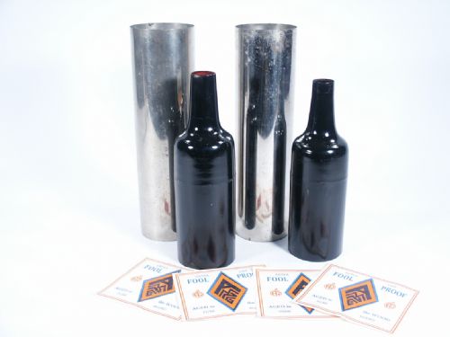 Two bottle set in metal with metal covers with bottles standing between 9 1/2” and 10” high. Includes bottle labels for application if desired. Condition light surface rust on inside of reservior bottle otherwise good.