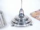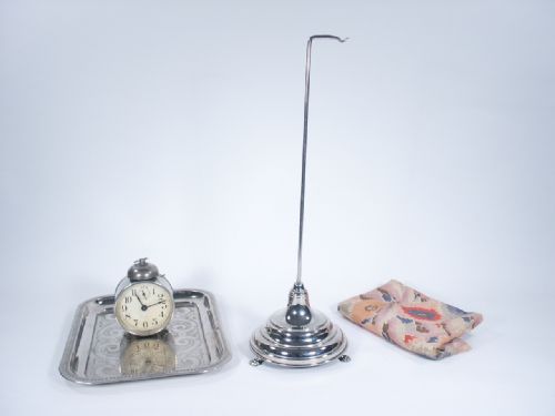 Beautiful mechanical ringing stand with claw feet adornment along with tray and clock and special covering with form. The clock is absent the flat metal tab which engages the receiver slot on the tray, the tab is a simple piece to have made and affixed back in place on the base of the clock. The tone of the mechanical ringing stand is amazing and by the way it conveys the sound of a ringing alarm clock up to the moment it is vanished. A scarce item and one you should enjoy.