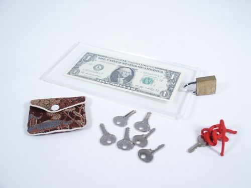 From Great Britain. A plex frame with a banknote is secured with a brass padlock and one key is shown to open the lock with four others also being shown. All keys are mixed and four spectators are allowed to choose a key leaving one for the magician and when the keys are tried it is found that the magician's key is the only one which opens the lock! Includes instructions and this Penta Lock has 12 keys instead of the stated five. Money not supplied. This is a really beautiful effect and in First Rate Condition.