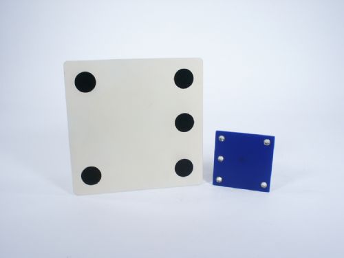 One in blue plex with Rhinestones measuring 3” square and the other in metal ivory color with black spots measuring 6 3/4” square. Condition very good.