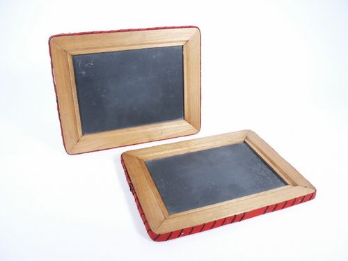 Early set with red cloth binding on edges and measuring 10” x 8”. Showing both sides of both slates to be without chalk writing they are stacked together and at the proper moment for the reveal they are separated and ghostly writing has appeared on one slate and if desired on both! Slates may be handled in a casual manner as they are locking style. A quality made item from Thayer. Condition good.