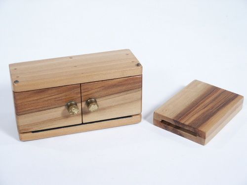 Haenchen effect with a half dollar size coin (not supplied) that when placed in a chest with two doors vanishes with the spectators thinking they know what really happened as only one door is opened at a time. Finally both doors are opened showing it has vanished and it is seen back in the separate wood container. Includes instructions. Condition very fine.
