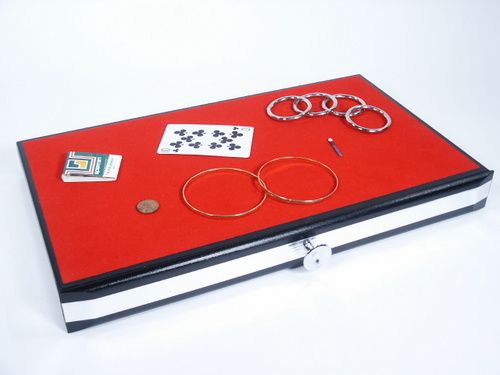 A nicely made wood drawer unit that measures 15 3/4” wide x 9 1/2” deep plus knob x 1 3/4” thick and having a felt top acts as a close up performance surface. Includes rings and other nifty additions which enable for some spooky manifestations. You will also find a small round magnet along with a PK Magnet measuring 3” x 2 1/2”. Includes illustrated instructions. Get this and have some fun! Condition very fine.