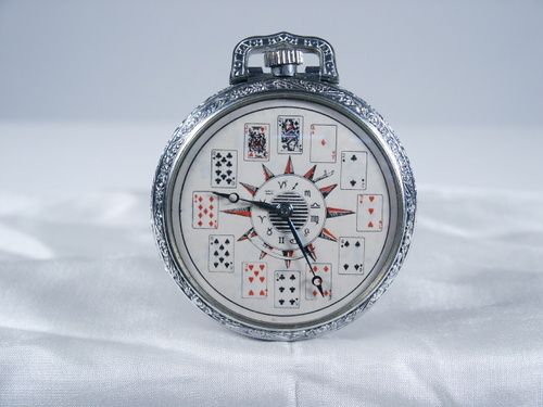 A pocket watch with a face having playing card images around the dial is shown along with a deck of cards placed in full view (not supplied). The spectator is asked to wind the stem and suddenly the hands spin around and around finally coming to a stop. The card stopped at is noted by a spectator and the magician picks up the deck of cards and spreads it out and one card is seen reversed in the deck! The card is turned over and it matches the card randomly arrived at by the hands of the watch. By this description you will likely know the type of deck necessary for this routine. Other ideas may suggest themselves with this nice pocket watch in hand. Condition very fine.