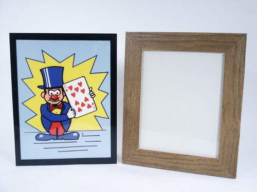 A chosen card is noted and replaced in the deck (not supplied). The magician holds a board telling the audience he will draw the chosen card. He then displays his drawing which is a line drawing of a cartoon magician holding a blank card. The sketch is placed in a clear blank frame and after a time with the audience the picture is taken out of the frame and as it is removed the picture visibly becomes colored revealing the chosen card! This is a really nice version of the magic picture frame and measures 11” x 13”. Includes instructions. Condition very fine.
