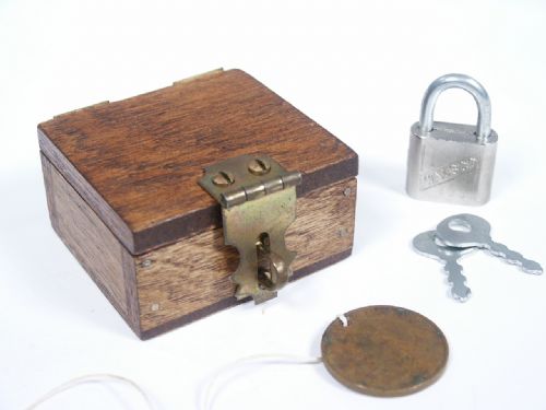 Many versions have been made and this one of mahogany wood measuring 1 7/8” wide x 1 3/4” deep x 1” high exclusive of brass hardware affixed with slot head screws. The fit on the special panel is as it should be and this includes the padlock with keys and coin with thread attached as detailed in the instructions. One of the best uses for this special box is one by Don Alan making use of a signed bill that finds its way into the locked box. The Don Alan routine is included in the instructions as well as the standard routine. Condition very fine.