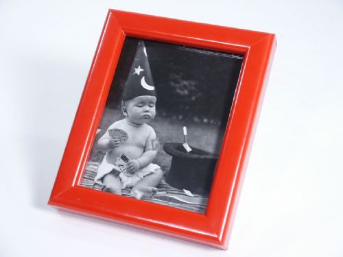This was a rather pricey apparatus selling for $70 at the time of the release. A picture frame measuring 5” wide x 6” high that is set up mechanically like a Hartz frame. Several uses are given for the the frame one is that of a chosen card mixed in with a packet of cards that are dropped on the frame laying on the close up mat and the selected card appearing within the frame! Also included is the charming baby magician picture. Includes 2 pages of instructions. Condition very fine.