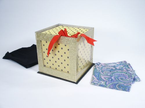 A colorful wrapped birthday present sealed with a bow is shown on a tray. The present is inside a transparent cube which is covered for an instant with a colorful cloth and when whisked away the wrapping has vanished and in its place is whatever you can place into a 7” cube! The entire unit packs flat and fits nicely into a fitted cloth bag. Includes instructions. Condition very fine.