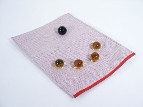 A cloth bag is shown to contain 5 glass balls with one being black in color. Five participants are asked to each secretly take a ball and look at its color and replace it in the bag which after all is set aside. The performer is able to identify the participant who picked the black ball! Patter lines may be around a secret lottery selection with how the mob conducts certain business. Includes 3 pages of instructions. Condition very fine.