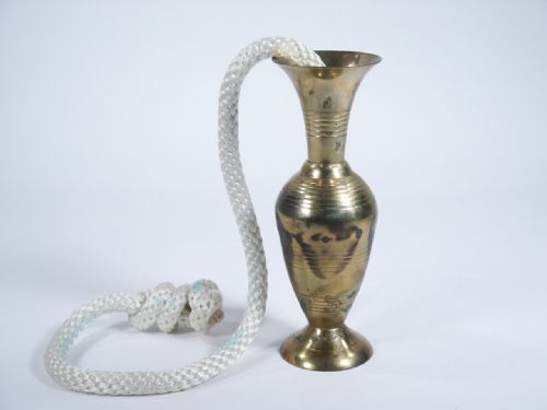 Standing nearly 8” high and with a thick braided rope of 1/2” diameter for the effect of the vase being suspended at the end of the rope. Includes instructions. Condition when found this had the rope wrapped around the brass vase and patina occurred on the vase and a light green tint on the rope otherwise fine.