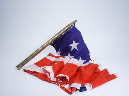 A solid brass flag staff 5 foot in length having a flag measuring 54” x 36”. Staff works well and flag is very fine condition. Includes instructions. Condition brass has patina that could use a good polish otherwise fine.