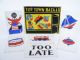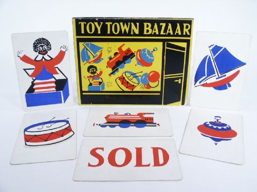 An early effect with a special Tyler folder and cards measuring 4 1/2” x 7” with images of wonderful toys upon them. After a toy is chosen all the other toys are removed one at a time leaving the selected toy within the folder. The last card with toy is removed and it says “Too Late” and the folder is dropped open showing it empty. When the words come from the audience that it's on the other side the card is turned around and the magician says “It's Sold”. Circa 1940's. Includes instructions. Condition good.