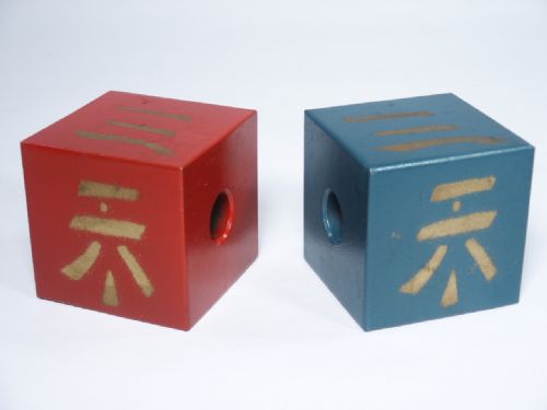 A red and green block 2 3/4” square are threaded on 6' long tapes (not supplied). Two spectators hold the ends of the tapes and the blocks are slid back and forth along the tapes. The magician cuts between the blocks with a pair of scissors and the blocks are held far apart with the magician walking between them to show they are actually separate. The blocks are put together and the spectators are told to see-saw the tapes and they are seen to be restored! Each spectator is told to drop one tape and the magician walks backwards and the tapes stream out of the blocks fully restored! This may be performed with people all around and close up. It is said to be easy to do and impossible for anyone to catch on to it. Circa 1940's. Includes illustrated instructions. Condition very fine.