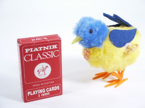 Walter is an Educated Bird with the ability to hop around on cards landing on one that was previously predicted with an outcome unlike the classic Ranch Bird effect by Don Alan. This time a second deck of cards is opened to find one card reversed and it is a duplicate of the chosen card and to prove that Walter is psychic the spectator is asked to turn the card over and on the back is found what Walter left to mark it! Walter is made from a German toy company and stands 4” high along with a 4” body. Includes cards and 2 pages of instructions. Condition as new.