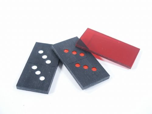 Produced in 1989 and well made. Two dominoes are shown, one having all white dots and the other, all red. The dominoes change places and the effect is repeated. The red domino is covered with a piece of red plexiglass and as the plexiglass is slid away the dots change to white! The red domino is placed in the pocket and the white on the table and again they change places. Repeating this one more time they again change places! At this point the dominoes are handed for examination with nothing to find! A well crafted mechanical set that is beautifully made. Includes instructions. Condition First Rate.