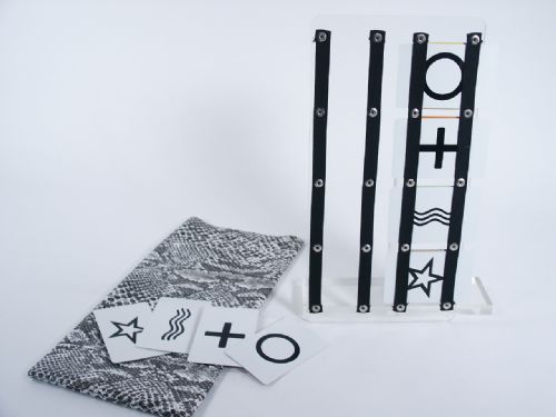 Two sets of E.S.P. cards are shuffled with performer placing cards at random on side of plex opposite the numbers. Spectator is asked to hand one card at a time face down with direction as to which number position they desire. Turning over the plex it is seen that all cards match! Includes instructions. Condition very fine.
