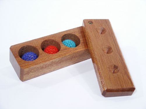 A handsome wood chest measuring 5 3/8” long x 1 3/4” deep x 1 3/4” high has a pivot lid on top of which are 3 crochet knit balls in different colors. A spectator selection is made of one during the performer's absence or turned back and the balls are gathered and handed to the spectator with request they be dropped into the three holes in the box. The lid is replaced and the box handed to the spectator to hold. The performer states a prediction is in his pocket and reaching in to remove it they name the color and the hand is opened and it is a ball of the same color as the one they selected! The kicker comes when the spectator is asked to open the box which is done and the selected ball is missing! A nicely made effect including 2 pages of illustrated instructions. Condition as new.