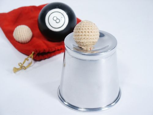 The original Master Cup Jr. which stands 3” high with a mouth diameter of 3 1/4”. Included are the original chop ball set along with final load ball of an 8 ball and drawstring velor bag. Condition couple of small dents otherwise fine.