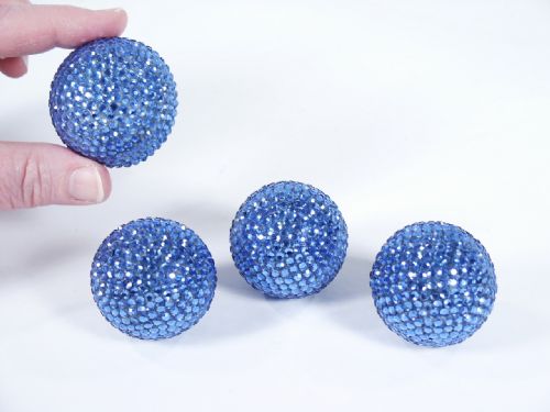The multiplying billiard ball effect taken to the highest level of beauty as with each ball it is like holding a sphere of stardust. The balls are 1 5/8” in size with each covered in rhinestone brilliants. The set includes 3 solid balls and 1 shell and in the color of blue. These were hand made in France and from 1972. Condition minor absence of a few rhinestones (a few extra are included) otherwise good.