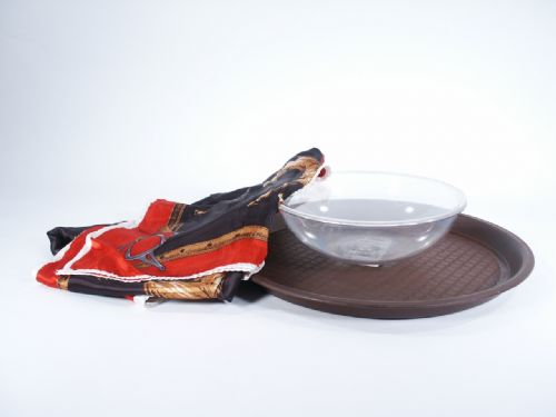 The bowl diameter is 8 3/4” with a height of 3” and comes along with a tray and foulard. Showing a large plastic bowl upon a tray the magician fills it with water from a regular pitcher (not supplied). The bowl is covered with the foulard and removed from the tray with its shape clearly seen within the foulard. Moving forward with the covered bowl the magician gives the foulard a toss into the air and the bowl of water has vanished! This is a big effect that will carry in a small suitcase. Includes instructions. Condition very fine.
