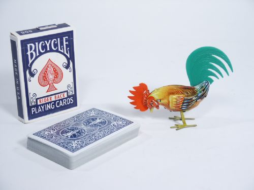 The original German made metal Rooster along with special deck for a humorous and mystifying revelation of a card chosen by a spectator. Includes 4 pages of instructions. Condition very fine.