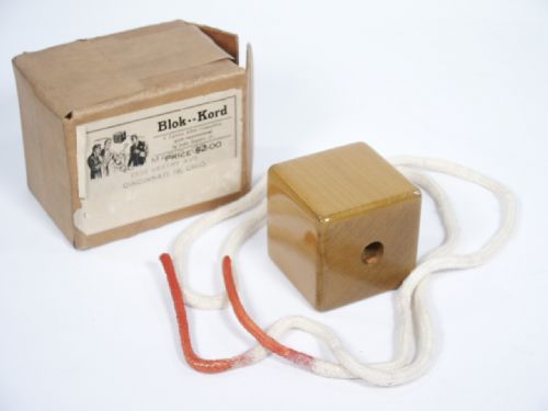 The earliest block release from rope using a polished solid hardwood block 2 1/2" in size along with the rope with red tipped ends. This is still the best block from rope release and one that can be fully examined by a spectator. From 1945 and includes 2 pages of instructions with illustrations by Hahne. Found still wrapped in tissue in the original box. Condition First Rate.