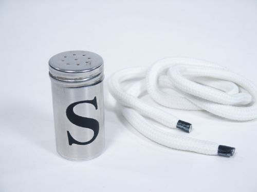 After performing a few finger ring off rope effects, the ring vanishes at a surprising moment and appears within a salt cellar much to everyone's amazement! The salt cellar is a well made bill tube principle. Not included is the simple felt holder with safety pins that is pictured in the instructions but would not be difficult to put together. Includes 2 pages of photo illustrated instructions. Condition very fine.