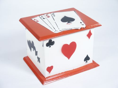 Produced by Stge & Company, this with attractive card inspired decoration for the very magical effect of a chosen card rising from within after a deck is placed inside. Includes instructions. Condition very fine.