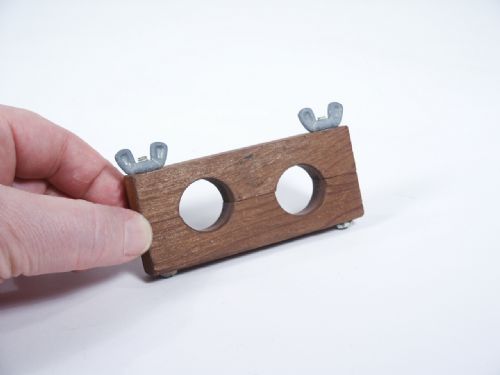 Made of walnut wood for securing the magician's thumbs and even though restrained may be able to pass arms onto a chair or the like. These are specially made so they may be shown then opened and reassembled over the magician's thumbs with a subtle maneuver that allows the magic to happen. Condition very fine.