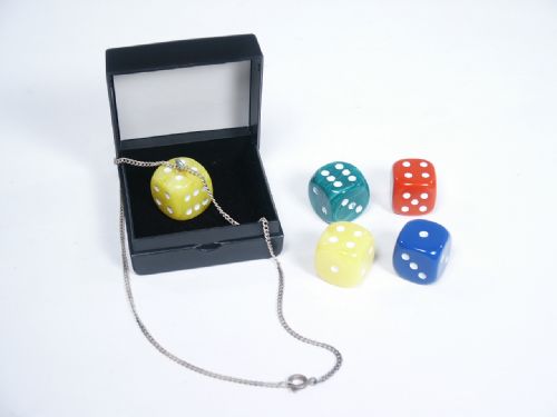 A small jewel box is said to contain the prediction of the magician. In a glass (not supplied) are 4 dice in different colors. A spectator is asked to choose one of the dice an absolutely free choice. After making his choice the magician takes one and then the spectator is asked if he will change his die with the one the magician has or keep the first one. When the spectator has been satisfied with his choice the magician opens the box and pulls out a necklace and linked to the necklace is a die in the same color as the chosen one! The box is shown empty. A very clever divination. Includes instructions. Condition very fine.
