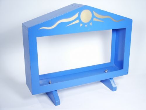 A nice free standing frame unit made of wood that measures 17” wide x 14 1/4” high x 4” deep at the frame not including removable feet. A balloon is inflated and placed within the frame after which the balloon bursts at the will of the magician and two doves or one if preferred make a sudden appearance and they are excited to do so. Condition visible 1 1/8” surface break to flat panels on frame but not loose and not affecting performance, otherwise very good.