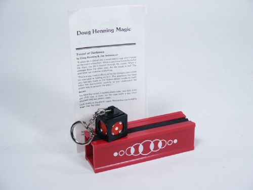 One of my particular favorites where a white die is imprisoned in a small open frame hanging on the end of a key chain. While a spectator holds the end of the chain the die in its frame is passed through the tunnel and when it emerges from the other end the die inside is red! Everything may be examined! This was sold as a Doug Henning and Jim Steinmeyer collaboration with the Tenyo manufactured apparatus. Includes instructions. Condition First Rate.
