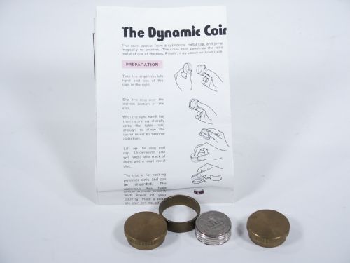 Five coins appear from a cylindrical metal cap and jump magically to another. The coins then penetrate the solid metal of one of the caps. Finally they vanish without a trace! Includes illustrated instructions. Condition fine.