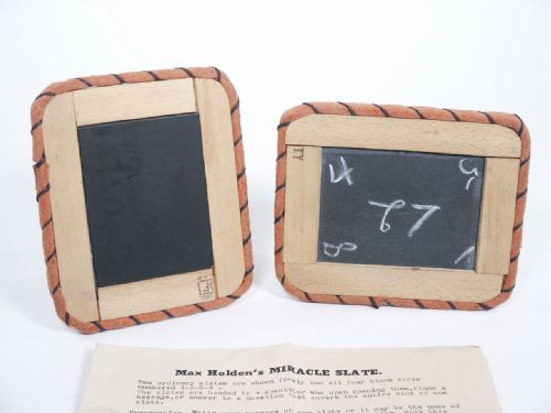 This early set of of slates includes flaps for the Spirit Slate effect and illustrated instructions for the effect of Miracle Slate by Max Holden with illustrations to make clear the proper handling of slate turning. Also includes Master Spirit Slates instructions. Condition fine.