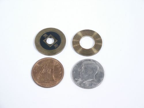 A triple coin transformation with a super surprise climax! Sterling Magic Creations, Inc. A Chinese coin changes into a half dollar, then back to a Chinese coin. Clink! Oops… Two Coins? Yes!! Open your hand to reveal an English Penny and a Brass Washer, and hand them out for examination. Includes 3 pages of illustrated instructions. Condition fine.