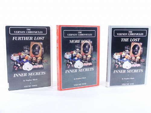 | *The Vernon Chronicles Volume One: The Lost Inner Secrets, Stephen Minch, 1987, 1st Edition, cloth bound with gilt stamping, 235 pages, illustrations and photos. Contents: On the Turn of a Card, Enlarging a Break, The Vernon All-Around Square-Up, Glimpse from the Twirl Cut, Hindu Transportation, No Sleight Triumph, The Second Campaign, The Persistence-of-Vision Coin Vanish and more. Condition *The Vernon Chronicles Volume Two: More Lost Inner Secrets, Stephen Minch, 1988, 1st Edition, cloth bound with gilt stamping, 245 pages, illustrations and photos. Contents: Dual to the Death, Aces to Order, The Daivergent Silk, The Trick that Cannot be Reconstructed, The Rendezvous Force, Driven to the Depths, Vernon on Gilbreath, Max Malini's Hypnotic Gaze Divination and more. Condition *The Vernon Chronicles Volume Three: Further Lost Inner Secrets, Stephen Minch, 1989, 1st Edition, cloth bound with gilt stamping, 219 pages, illustrations and photos. Contents: Subway Gambler's Palm, Flat Top Switch, Spellatron, Joker Monte, On Your Metal, Arthur Finley's Remote Control, Think-of-a-Card Solitaire, Faucett Ross' Twice Turned, The Contortion Palm, The Spring-Loaded Tip-Over Change, Black's Stack and more. Condition private collection identifier label, very light foxing top page edges, otherwise very fine. |